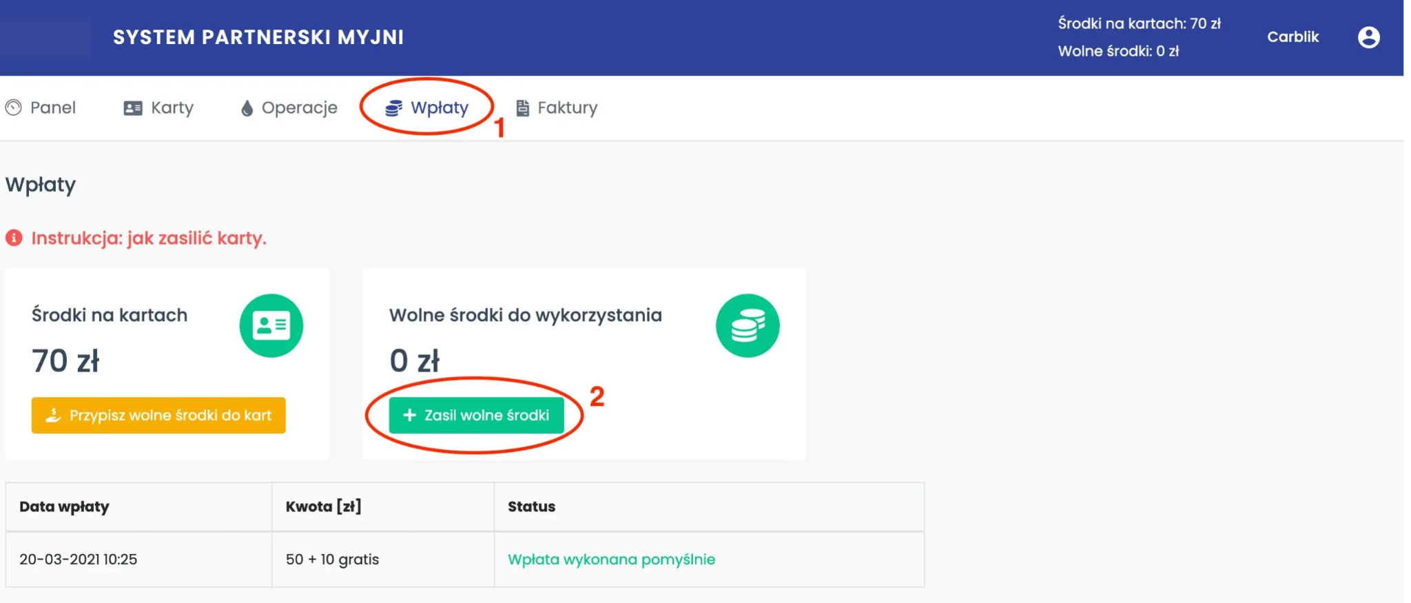 Aby zasilić wolne środki, przejdź do zakładki Wpłaty (1 na zdjęciu obok) oraz wybierz przycisk Zasil wolne środki (2).