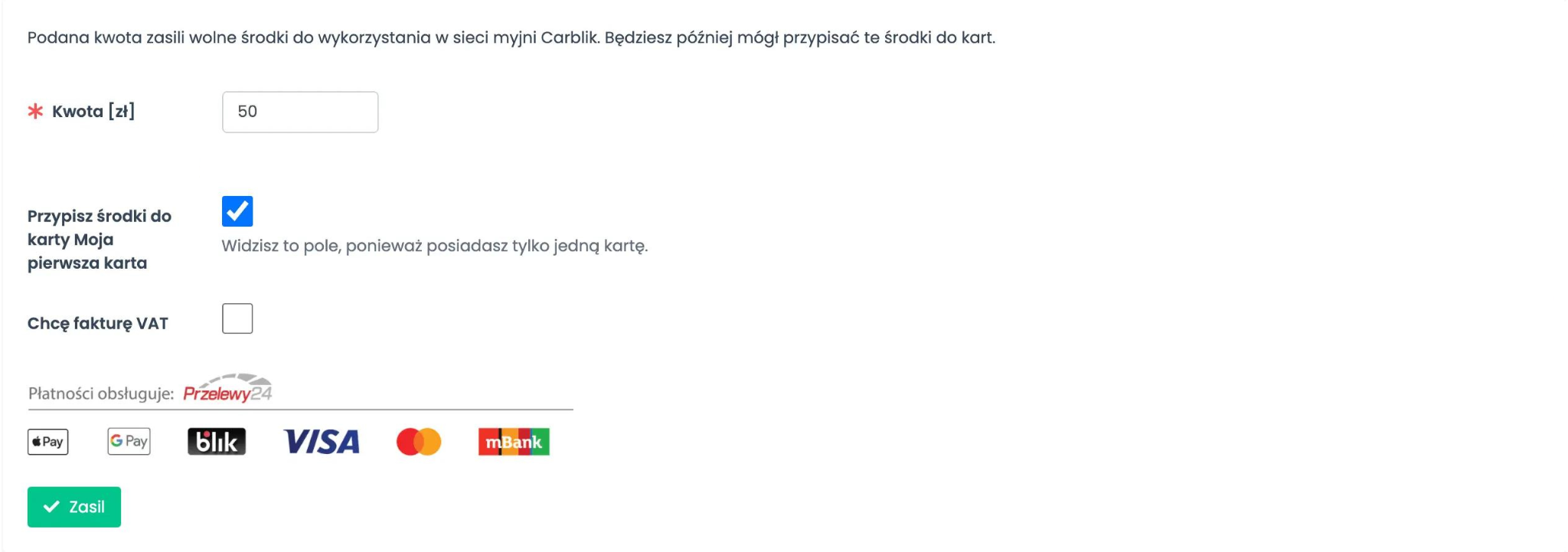 Jeśli masz tylko jedną kartę, podczas zasilania wolnych środków zaznacz opcję „Przypisz środki do karty…”, dzięki czemu przeniesienie środków na kartę odbędzie się automatycznie.
