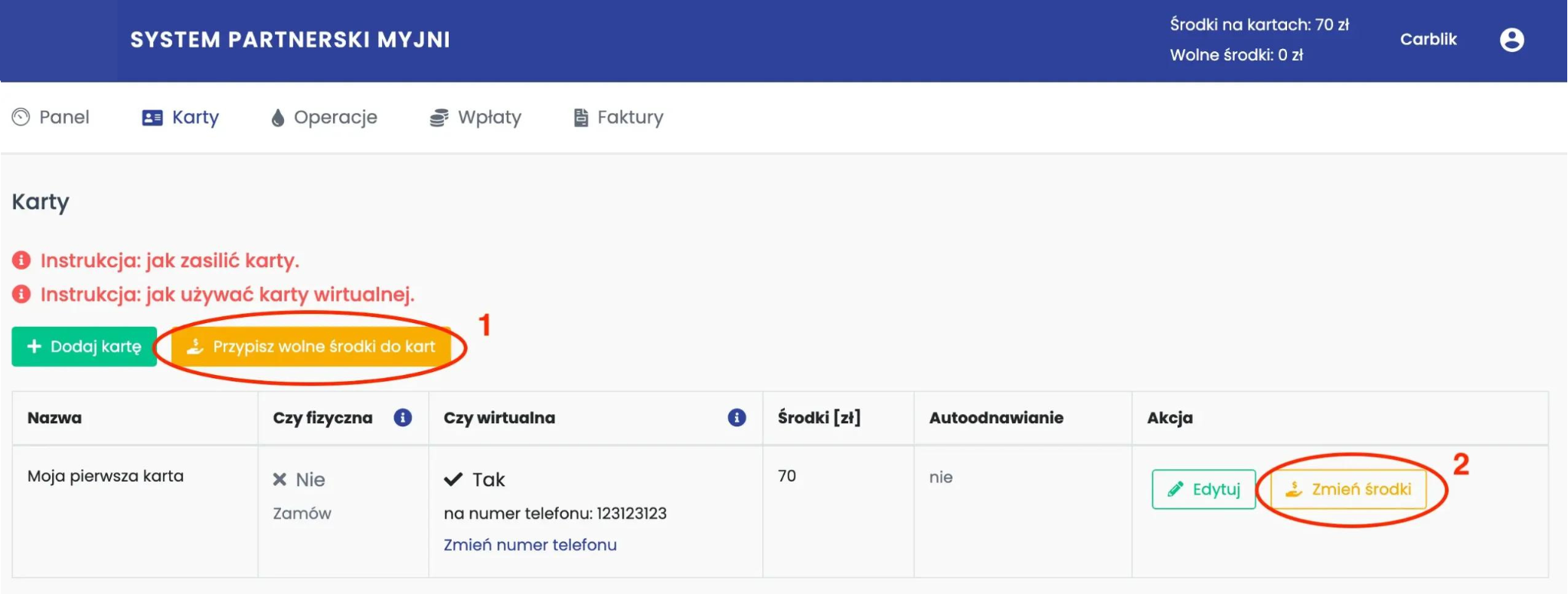 Jeśli masz więcej kart, środki na kartę możesz przenieść na dwa sposoby. W zakładce Karty wybierz: